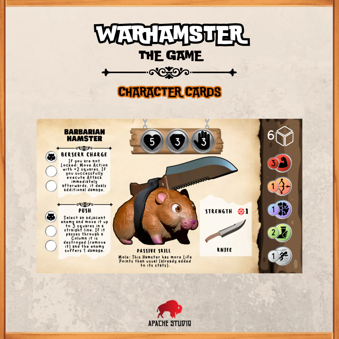 Warhamster The Game is a tactical miniatures game for 2 players, ages 8 and up. Each of them controls a band of three Hamsters that face each other on a square Board with the aim of getting more Victory Points (VP) than the rival.